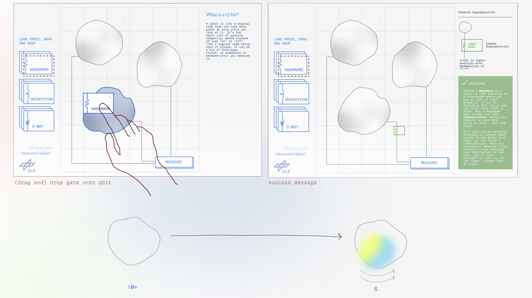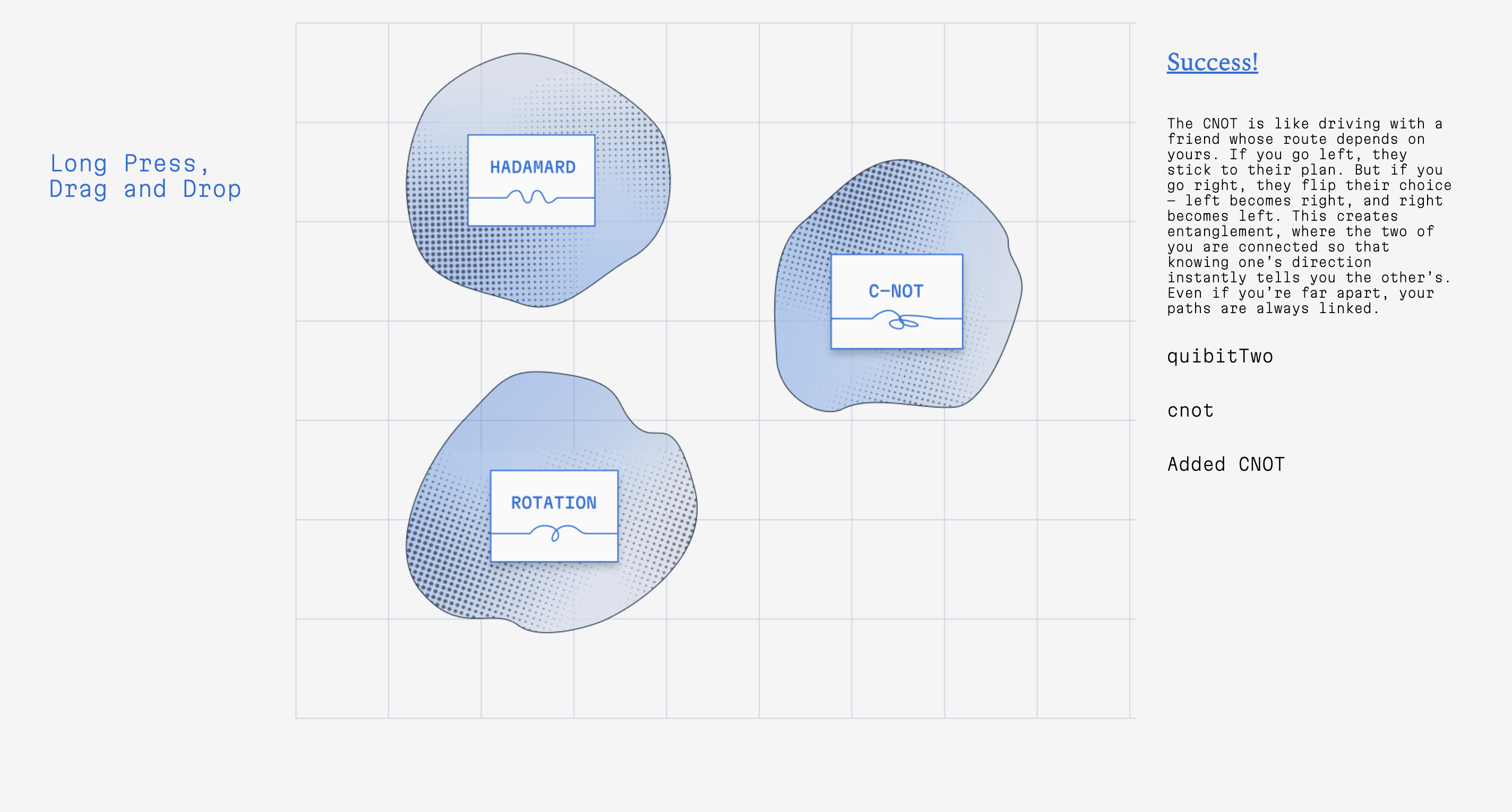 In the measured values world, users manipulate qubits by dragging quantum gates—like Hadamard, Rotation, and CNOT—onto individual qubits. A qubit is the basic unit of information in quantum computing. Gates alter the state a qubit exists in. As users drag gates, they can read about how each gate changed the qubit.