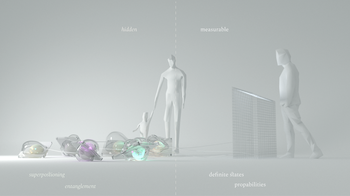 We used a two-world concept to explain quantum computing phenomena—one world showing the invisible aspects, the other showing the visible. Science often operates at a scale too small for the human eye to perceive. This project explains the science behind invisible forces like superposition and entanglement through interactive human experiences.
