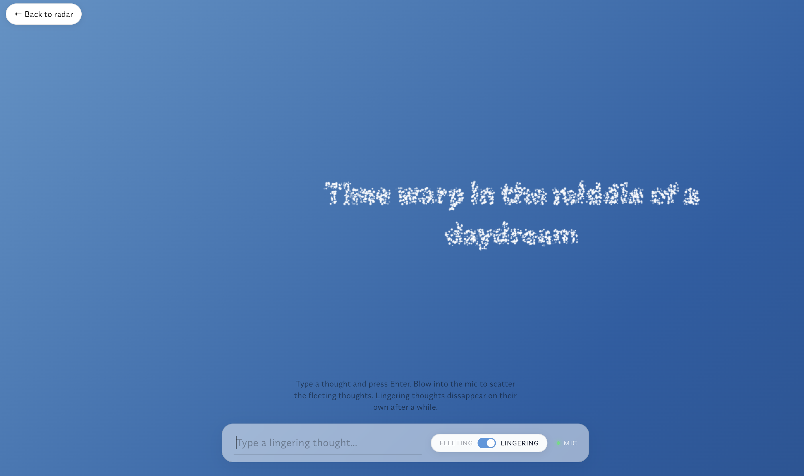 Thought Clouds is a digital sky where fleeting whispers and lingering curiosities take the form of clouds. It invites you to write your thoughts and watch them take shape in the sky. Fleeting thoughts scatter into the ether with a gentle breath into the microphone. Lingering thoughts drift longer, slow and stubborn, until distance makes them unreadable. Above it all, the sky keeps breathing, shifting colours from dusk to dawn.